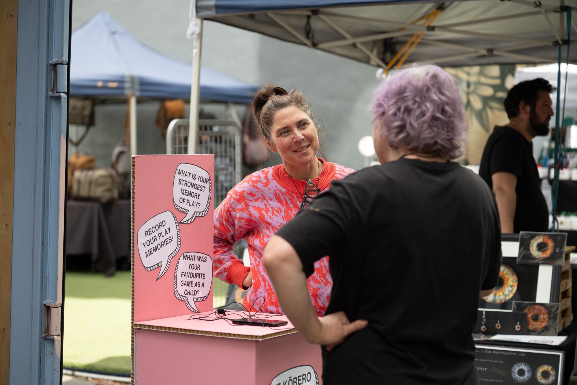 This interactive installation in Cashel Mall invited passersby to share their stories of play or interview each other about play using our story booth. Visitors also tried out the Kōrero Tākaro marble game and shared memories on postcard wall.